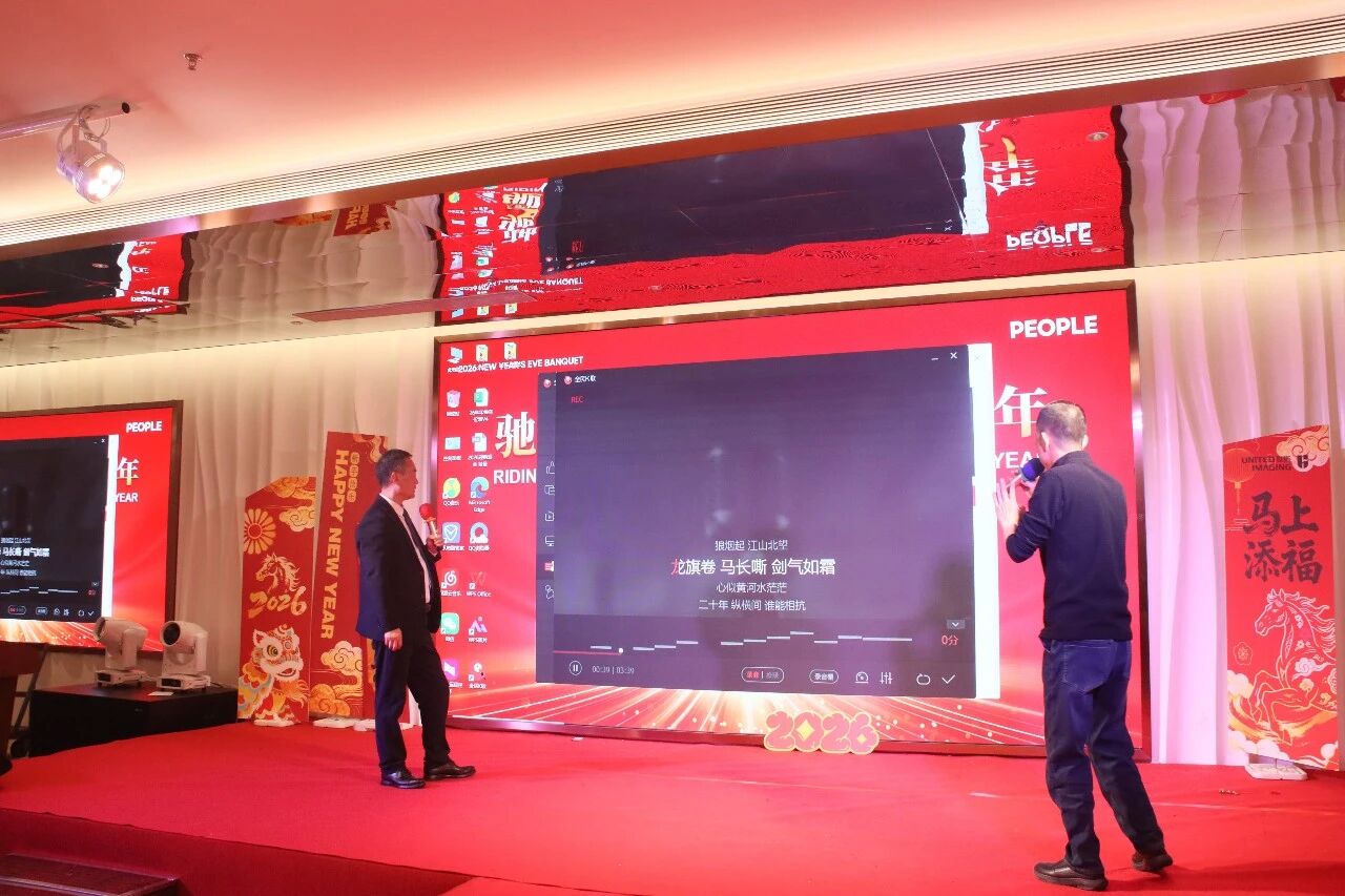 年会现场,郑元豹董事长首先代表集团向全体员工致以诚挚的问候和新年的祝福。他表示,回望2025年,集团以科技创新为引领,以品牌价值为支撑,以开放合作为路径,在多个维度实现跨越式突破,用实干和汗水交出了一份高质量发展的精彩答卷。展望2026年,集团发展必须紧紧围绕"五大战略"求发展,即方向战略、持续发展战略、40年战略、40年管理战略和40年资本战略,这既是集团发展的战略指引,也是实现高质量发展的根本遵循,为集团未来发展指明了前进方向。